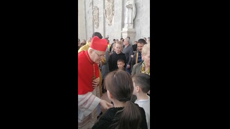 Erdő Péter bíboros mézeskalács báránykákat osztott a Bazilika előtt a gyerekeknek