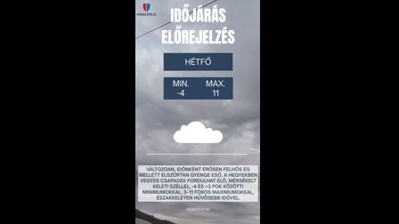 Többnyire erősen felhős vagy borult lesz az ég, a felhőzet elsősorban délnyugaton szakadozhat fel. Napközben a Dunától keletre növekszik a csapadékhajlam, az eső mellett havas esőre, reggel, délelőtt helyenként még havazásra is számítani kell. A déli, délkeleti szelet élénk, néhol erős lökések kísérik. A maximum-hőmérséklet 2, 9 fok között valószínű. S.R