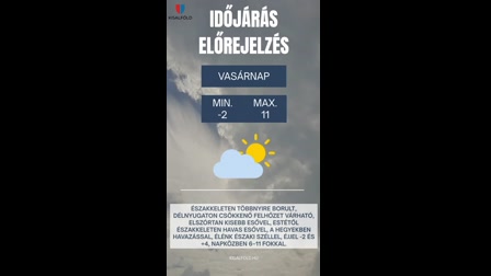 Nagyrészt erősen felhős, nyugaton néhol borult idő várható, de a Nyugat-Dunántúlt kivéve hosszabb-rövidebb időre felszakadozhat a felhőzet. Néhol kisebb eső, zápor előfordulhat, az Északi-középhegységben havas eső, kisebb havazás sem zárható ki. A keleties szél helyenként megélénkül. A legmagasabb nappali hőmérséklet 4 és 11 fok között várható, északkeleten lesz hűvösebb az idő.